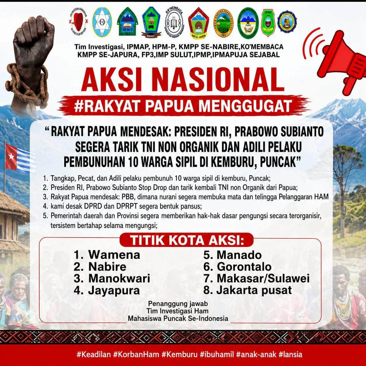 Melalui aksi ini, kami mengajak seluruh mahasiswa, masyarakat sipil, tokoh agama, pemuda, serta seluruh rakyat Indonesia yang memiliki kepedulian terhadap nilai-nilai kemanusiaan untuk bersama-sama menyuarakan keadilan bagi rakyat Papua, khususnya masyarakat Kabupaten Puncak. Aksi ini menjadi ruang bersama untuk menegaskan bahwa kekerasan terhadap warga sipil harus dihentikan, korban harus mendapatkan keadilan, dan para pengungsi harus segera memperoleh perlindungan serta pemenuhan hak-hak dasarnya.