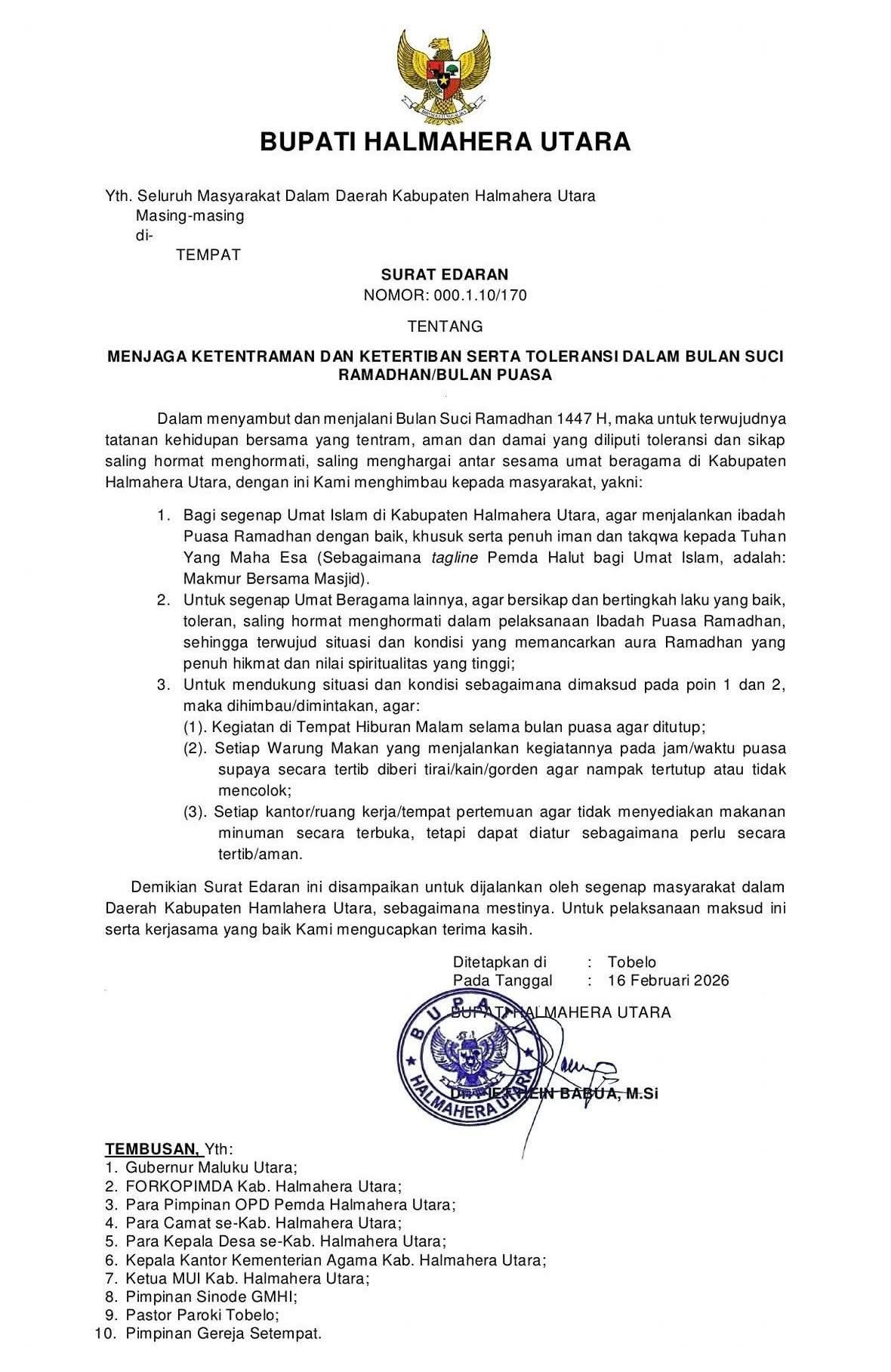 Tobelo, MGN – Bupati Halmahera Utara mengeluarkan Surat Edaran Nomor 000.1.10/170 tentang upaya menjaga ketentraman, ketertiban, serta toleransi dalam bulan suci Ramadhan/Bulan Puasa 1447 H. Surat edaran tersebut diteken pada tanggal 16 Februari 2026 di Tobelo.