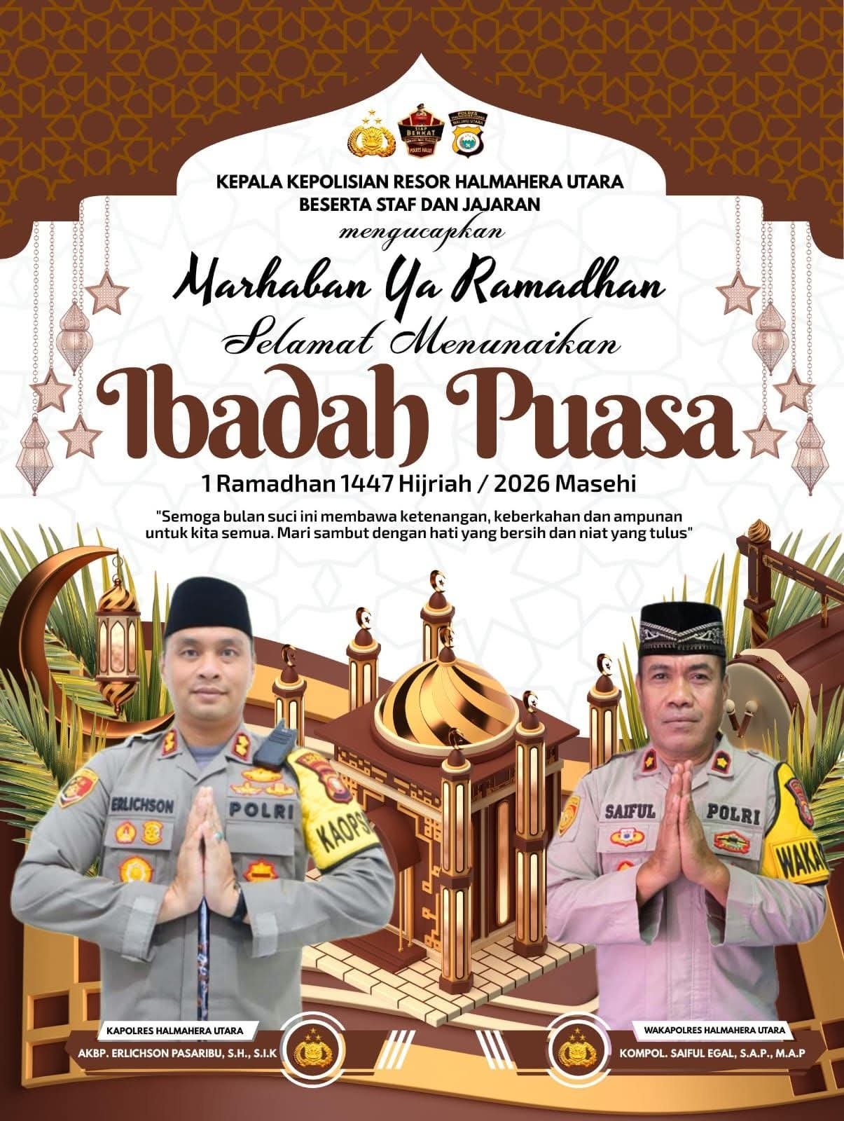 Ucapan tersebut disampaikan sebagai bentuk perhatian dan dukungan Polres Halmahera Utara kepada masyarakat dalam menyambut datangnya bulan suci Ramadan yang penuh berkah dan ampunan.