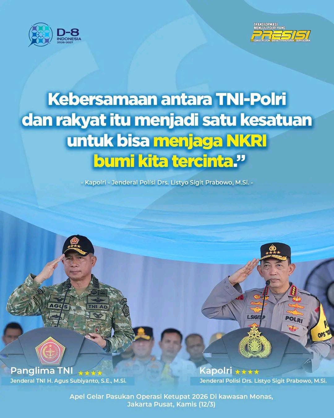 Pernyataan tersebut disampaikan Kapolri dalam acara buka puasa Ramadan 1447 Hijriah bersama TNI-Polri yang digelar di Lapangan Bhayangkara, Jakarta Selatan. Menurutnya, sinergi yang terjalin antara TNI, Polri, dan rakyat menjadi modal utama dalam menjaga stabilitas keamanan nasional.