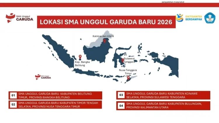 Empat SMA Unggul Garuda baru dijadwalkan mulai beroperasi pada Juni 2026. Sekolah tersebut berlokasi di Belitung Timur, Soe, Konawe Selatan, dan Bulungan.