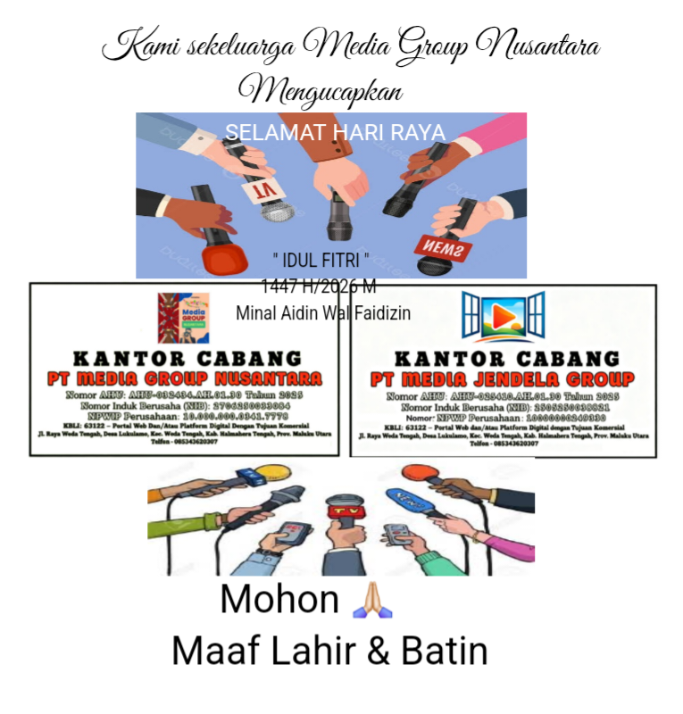 Tim redaksi mediagroupnusantara.com cabang Halmahera Tengah mengucapkan Selamat Hari Raya Idul Fitri 1 Syawal 1447 Hijriah/2026 Masehi.