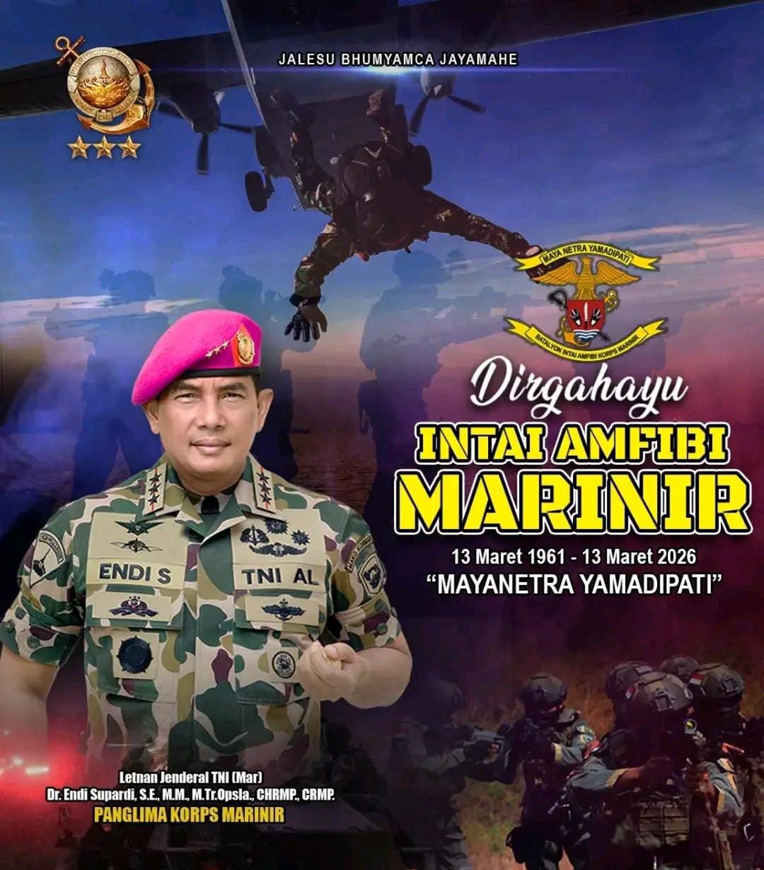 Jakarta – Panglima Korps Marinir, Letnan Jenderal TNI (Mar) Dr. Endi Supardi, S.E., M.M., M.T.Opsha., CHRMP., CRMP., bersama seluruh prajurit Korps Marinir menyampaikan ucapan Dirgahayu kepada Intai Amfibi Marinir (IPAM) yang memperingati hari jadinya ke-65 pada 13 Maret 2026. Peringatan ini menandai perjalanan panjang satuan elite tersebut sejak didirikan pada 13 Maret 1961 dengan moto “Mayanetra Yamadipati”.