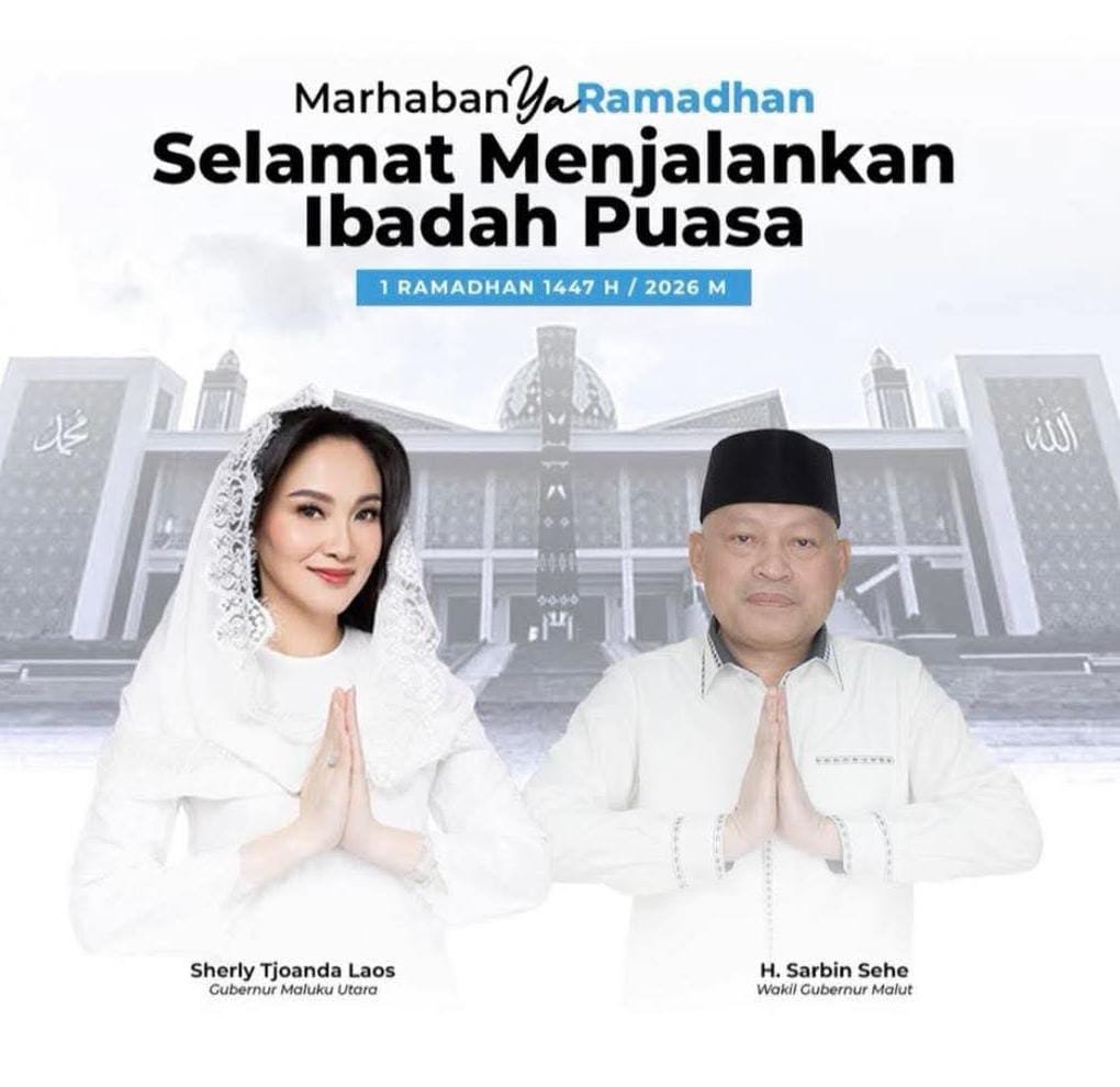 Ternate, (18/02/2026) – Pemerintah Provinsi (Pemprov) Maluku Utara melalui Gubernur Sherly Tjoanda Laos dan Wakil Gubernur H. Sarbin Sehe mengucapkan selamat menjalankan ibadah puasa bagi seluruh umat Muslim di wilayah Provinsi Maluku Utara pada Ramadhan 1447 Hijriyah/2026 Masehi.