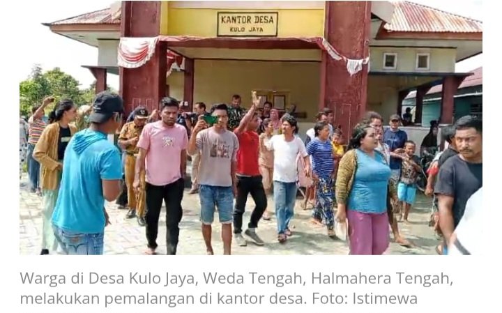 – Desa Kulo Jaya, Kecamatan Weda Tengah, Halmahera Tengah – Masyarakat di Satuan Permukiman (SP) 3 Desa Kulo Jaya melakukan aksi pemalangan kantor desa pada Selasa (4/3/2025). Aksi itu dipicu dugaan penahanan uang hasil penjualan lahan rental seluas 7 hektare yang dikelola PT Indonesia Weda Bay Industrial Park (IWIP) sebesar Rp 1,5 miliar oleh Kepala Desa (Kades) Fadli Sirajuddin dan Sekretaris Desa (Sekdes) Eka Hidayat.