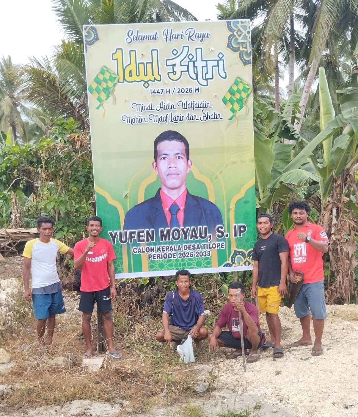 Calon Kepala Desa Tilope periode 2026–2033, Yufen Moyau, S.IP, memasang baliho ucapan Selamat Hari Raya Idul Fitri 1447 H / 2026 M di wilayah Desa Tilope, Kecamatan Weda Selatan, Kabupaten Halmahera Tengah.